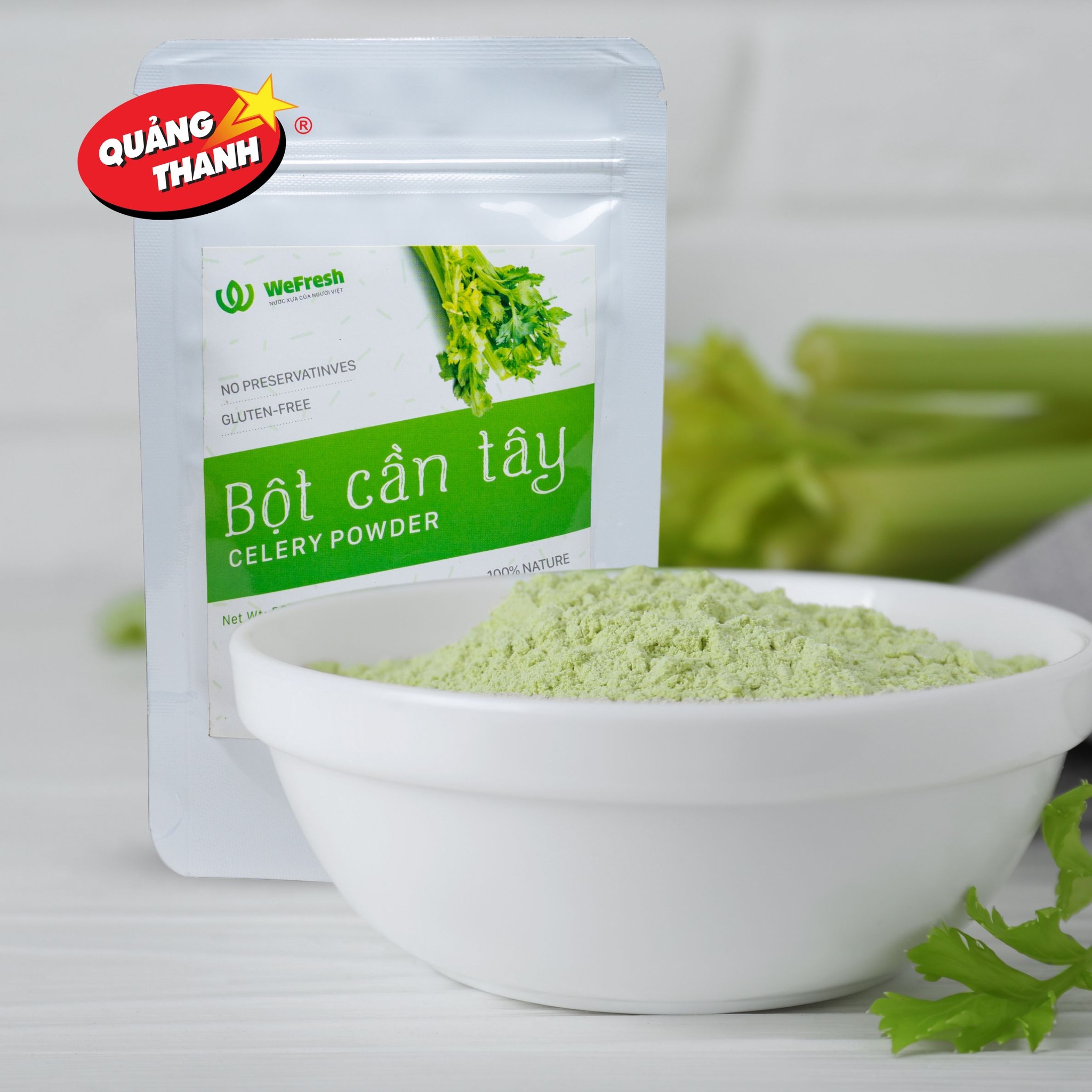 Bột Cần Tây Quảng Thanh được sản xuất từ 100% cần tây, không cành cọng. Sản phẩm sử dụng công nghệ sấy lạnh tiên tiến nhằm giữ lại màu sắc và hương vị vốn có. Cùng công nghệ tiệt trùng vi sinh độc quyền để đảm bảo chất lượng sản phẩm tốt nhất.